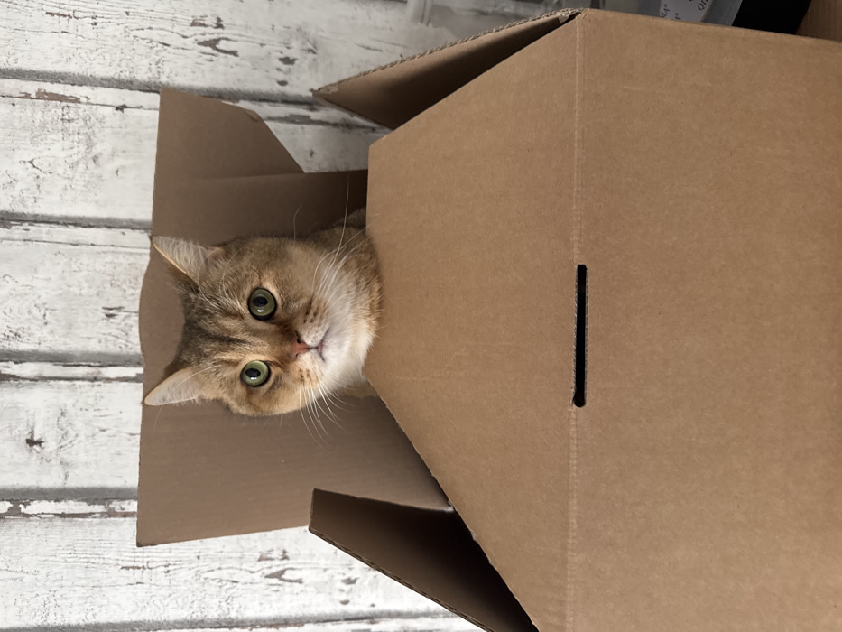 The scene, located indoors in l'Hospitalet de Llobregat, Spain, depicts a single feline subject. A short-haired cat, exhibiting golden-brown fur, prominent green eyes, and white whiskers, is positioned inside a brown corrugated cardboard box. Its head and upper chest extend above the partially opened top flaps of the box, with the cat directing an attentive, neutral gaze forward. The front panel of the box features a single horizontal slot, approximately 5 cm in length, situated centrally. The background consists of a wall adorned with a distressed white and grey wood plank-style pattern. In the lower right of the frame, faint outlines of a clear glass container and a dark rectangular object are partially visible.
