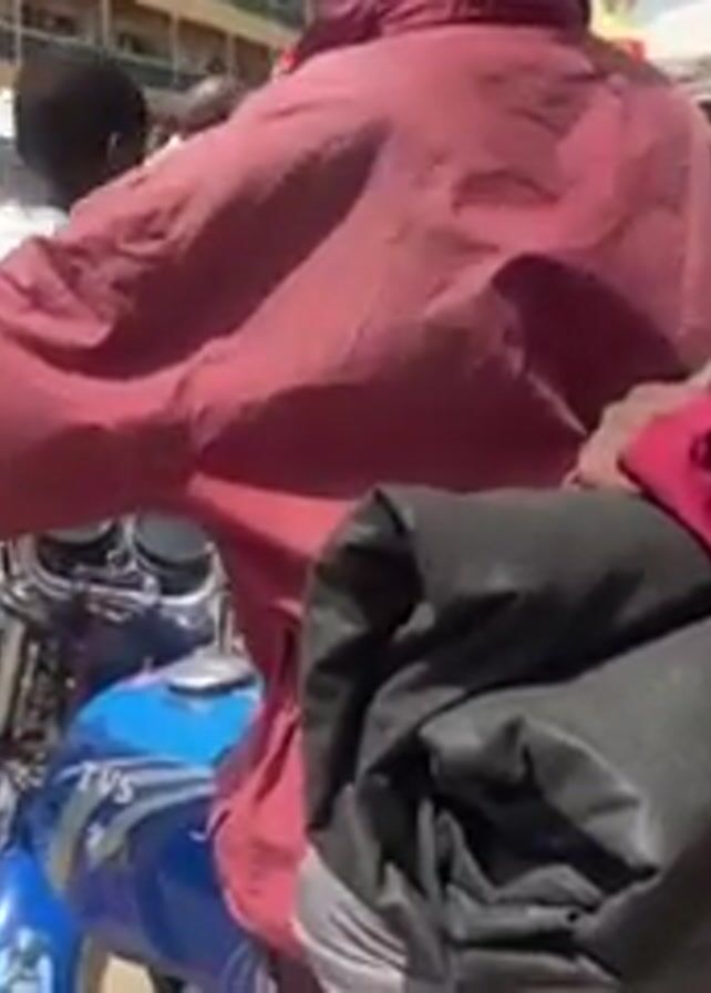 The video depicts a congested street scene, likely in an urban area. The focus is on a blue TVS motorcycle parked among other motorcycles and people. Several individuals are visible, including those wearing traditional attire like hijabs and others in casual clothing. The street appears to be dusty and busy with traffic.