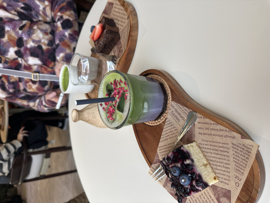 The scene depicts an interior view of a cafe in Innsbruck, Austria, focusing on a white tabletop set for two individuals. In the foreground, a wooden tray with an organic shape holds a slice of blueberry cheesecake, topped with whole blueberries and a glossy purple glaze, resting on decorative paper resembling an antique printed page. A silver fork is positioned beside the cheesecake. Another similar wooden tray is positioned further back, containing a clear glass tumbler filled with a layered drink, green on top and purple at the bottom, with ice cubes, red raspberry sprinkles, and a black straw. This glass rests on a woven rattan coaster. Beside it are a small, light brown ceramic vase-like object and a clear glass of water. A square chocolate brownie or cake, topped with a sliced strawberry and a single blueberry, also rests on decorative paper on this tray. Behind these items, a white mug containing a green liquid (likely matcha) is visible. Two individuals are partially visible in the background. To the right, a person wearing a patterned long-sleeved top with shades of purple, brown, and cream is seated, with a grey strap (possibly from a bag) crossing their shoulder. Their right hand is near the white mug. To the left, another person is seated at a different table, wearing a striped long-sleeved top (cream and dark stripes) and dark trousers. Both individuals are static, not actively interacting with each other or the foreground items. The environment features blurred additional cafe seating and ambient lighting.