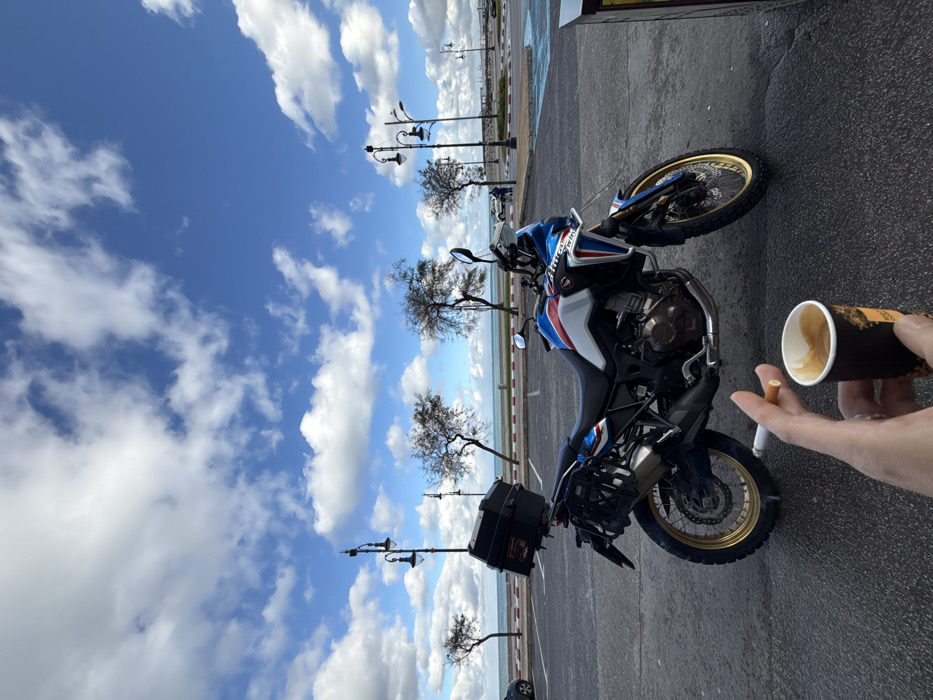 The image portrays a coastal scene in Tangier, Morocco, under a bright blue sky with scattered white cumulus clouds. In the immediate foreground, a light-skinned human hand holds a lit cigarette between the index and middle fingers, simultaneously gripping a black paper cup, containing a dark brown liquid consistent with coffee, between the thumb and other fingers. The cup features orange and yellow branding elements. Dominating the midground is a parked Honda Africa Twin adventure motorcycle. The motorcycle is distinctively colored in blue, white, and red, equipped with gold-colored spoked wheels and knobby tires. A black hard-shell top case is affixed to its rear rack. The vehicle is situated on dark asphalt pavement, displaying faint white parking lines. The background reveals a promenade separating the pavement from the sea. This area is punctuated by multiple ornate black street lamps with double light fixtures and several sparse, leafless trees. Beyond a red and white striped barrier or curb, the Mediterranean Sea is visible. A silver vehicle is partially visible parked on the far left, adjacent to the coastline. Distant urban or port structures are faintly discernible on the far right horizon.