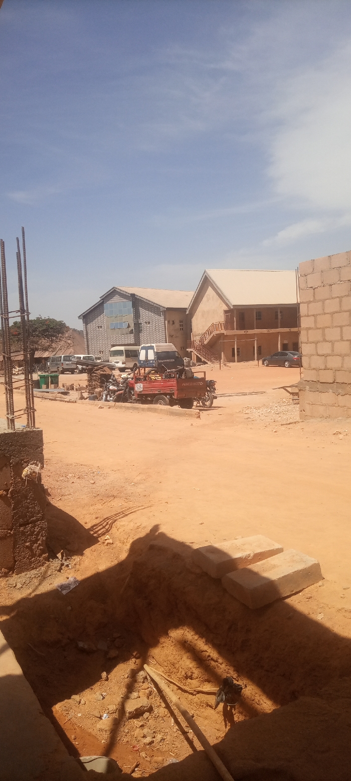 The image depicts an open construction scene in Bukuru, Nigeria, under a clear blue sky with minimal cloud cover