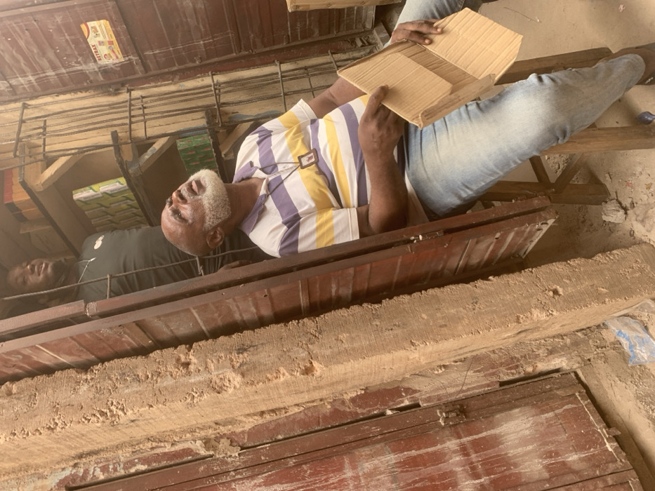 The image portrays two males situated within a weathered shop entrance in Fegge, Nigeria