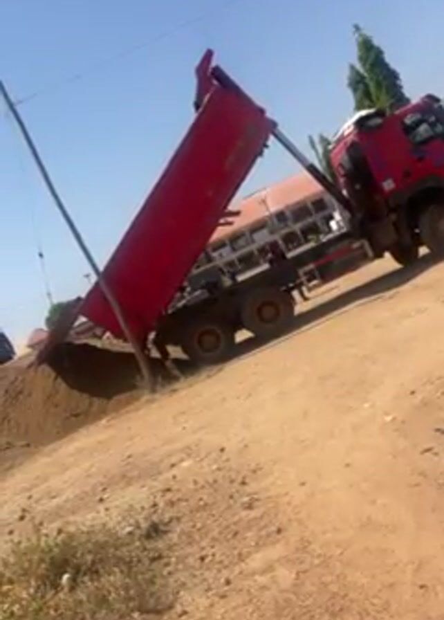 A red dump truck is unloading a pile of dirt on a dirt lot. The truck bed is raised at an angle, allowing the dirt to slide out. The environment includes a clear blue sky, a building in the background, and some vegetation. A utility pole with wires is also visible. The ground is dry and dusty.
