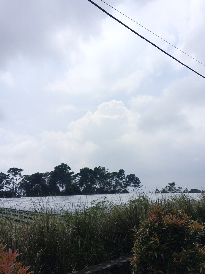 The image displays an agricultural landscape in Uato Carabar, Timor-Leste, under an overcast sky. The upper two-thirds of the frame are dominated by extensive, diffused white and light grey clouds. A single dark, thin wire, consistent with an electrical or communication line, stretches diagonally from the top-left to the top-right corner. In the midground, a continuous line of tall, dark green trees with visible trunks forms a horizon. Below this treeline, a large, flat structure covered in a light-colored, possibly white or translucent, sheeting material is visible, suggesting a greenhouse or covered crop field. The foreground features dense vegetation, primarily tall, thin-bladed green grasses across the lower-left and center, and a smaller bush with reddish-brown and green foliage in the lower-right. A dark, textured surface, possibly a low stone wall or elevated ground, is partially visible along the bottom edge of the frame. No individuals are present, and no actions or interactions are depicted.