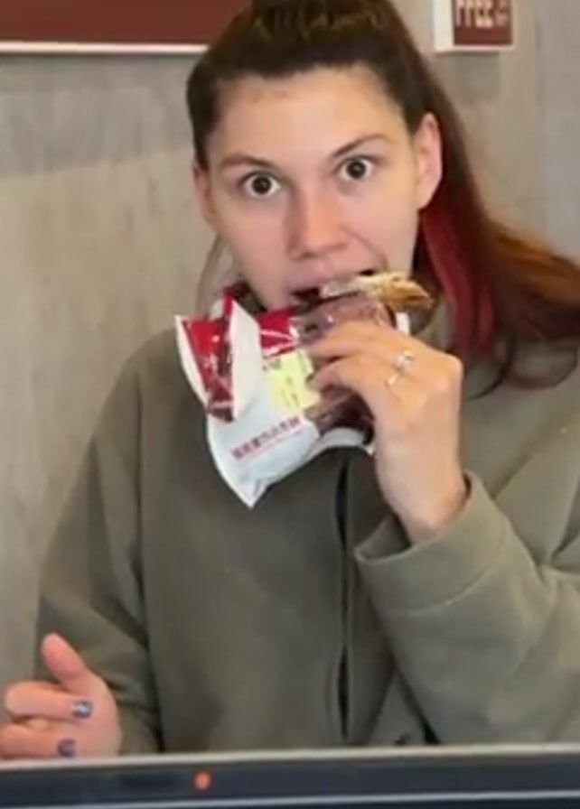A woman is eating a packaged pastry in what appears to be a coffee shop