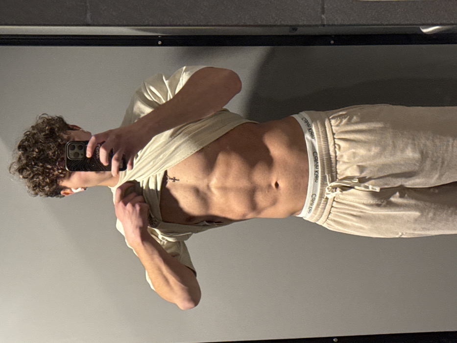 A young individual, appearing male, with curly brown hair and light skin, is depicted taking a mirror selfie indoors in Chantepie, France. The subject wears a light-colored (beige/off-white) short-sleeved t-shirt, which is pulled up by their left hand to expose a defined abdomen. A small, metallic cross pendant is visible around the neck. Below the t-shirt, the waistband of white Calvin Klein boxer briefs is visible, topped by light-colored (beige/tan) casual sweatpants with a visible drawstring. A white wireless earbud is present in the subject's right ear. The face is largely obscured by a dark-colored smartphone, held in the right hand, used to capture the image. The background consists of a plain, light grey wall, with a dark vertical element visible on the right side of the frame.
