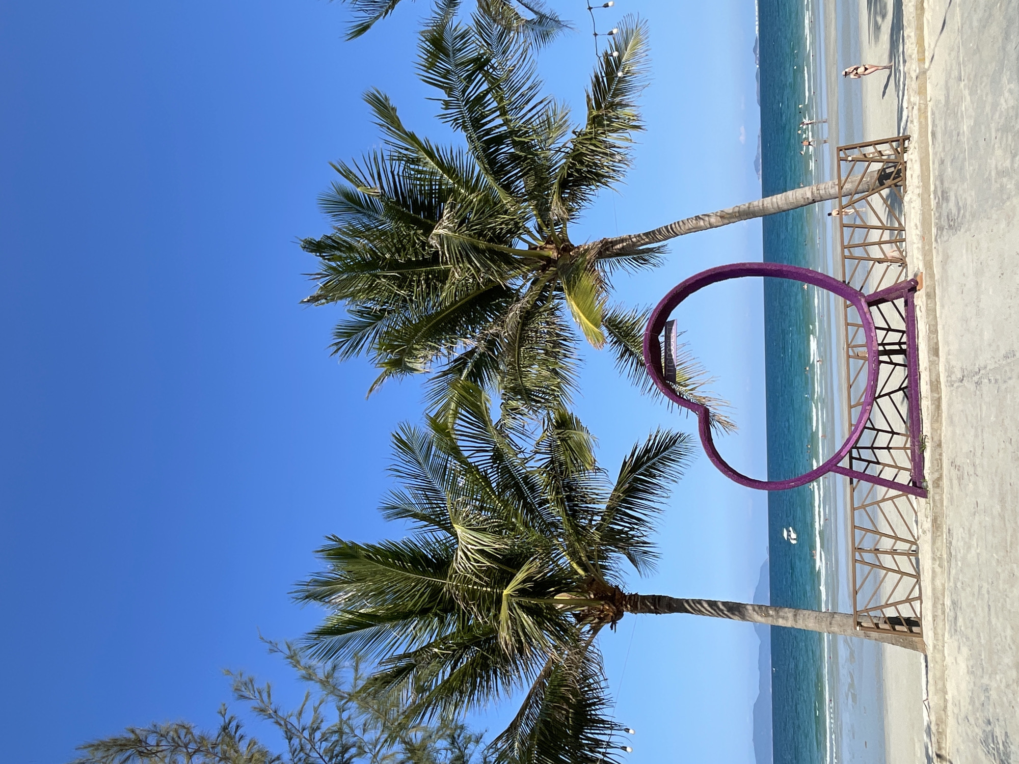 sunny beach scene with two palm trees dominating the view under a clear blue sky. A purple heart-shaped structure stands on a concrete surface, framing the beach and ocean. People are seen on the beach, both on the sand and in the water. The location is Dong Ninh Hoa, Vietnam.