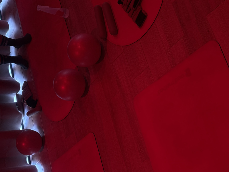 The image depicts an indoor fitness studio or exercise room, located in Puebla City, Mexico, under predominant deep red ambient lighting. The floor is constructed of wooden planks. In the upper central portion, a pair of human feet, clad in black socks with white lettering, are positioned on a circular exercise mat. To the upper left, a white curtain is visible, partially obscuring a bright, cooler light source. Below this curtain, a single red exercise ball rests near another rectangular exercise mat. Near the center of the frame, two additional red exercise balls are situated on the circular mat. To their right, two elongated, cylindrical exercise objects (possibly light hand weights or resistance bars) are present. Further to the right, a clear plastic water bottle with a white cap stands upright. Additionally, on the far right of the circular mat, several dark, stacked items, possibly small weights or resistance accessories, are visible. A second rectangular exercise mat is partially visible in the bottom left foreground.