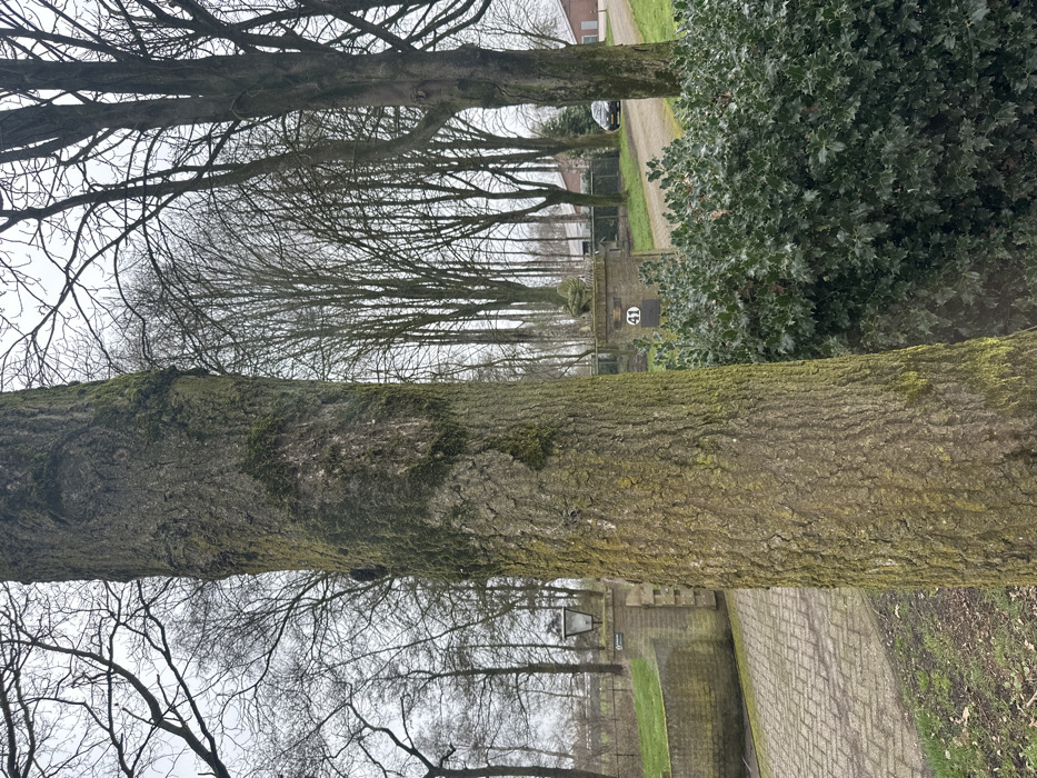 The image captures an outdoor scene in Sint Anthonis, Netherlands, under an overcast sky. A large, moss-covered tree trunk, displaying textured bark and green lichen, occupies the central and left foreground. At its base, sparse grass and dirt are visible. To the left, a herringbone-patterned brick pathway leads past a weathered brick wall and a pillar featuring a black lantern. To the right, a dense, dark green holly bush fills the lower right foreground. Beyond the main tree, an entrance is defined by two substantial brick pillars. The right pillar is topped with a decorative sculpture and has a black sign with the white numeral "41" affixed to its front. A light-colored dirt or gravel driveway extends past these pillars, curving to the right into the background, where a dark-colored sedan is partially visible. The background is characterized by numerous bare-branched deciduous trees, forming a dense line under the light grey sky. No individuals are present in the scene.