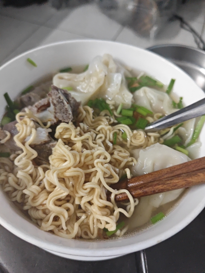 A white bowl containing a soup dish is observed in an indoor setting, presumed to be in Thủ Đức, Vietnam. The bowl rests on a dark, possibly metallic or tiled, surface. The dish comprises a light-colored, wavy instant ramen-style noodle base submerged in a clear, light brown broth. Visible ingredients include several pieces of dark, cooked meat, appearing to be bone-in cuts, and multiple folded, light-colored wontons or dumplings. The soup is garnished with chopped green onions. A pair of brown wooden chopsticks is positioned across the rim of the bowl, partially submerged, while a metallic spoon is also partially visible within the broth on the right side. In the blurred background, a light-colored tiled floor and a metallic pot or container are discernible. No individuals are present in the scene. The arrangement suggests the meal is prepared for consumption.