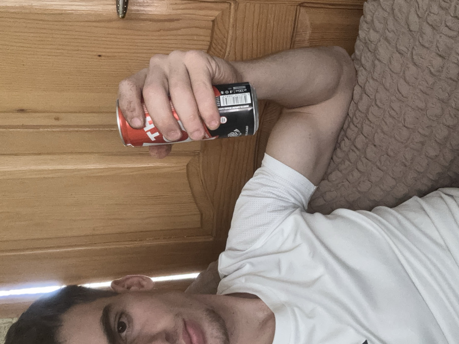 The image displays a close-up, indoor scene featuring a male individual. The subject is a fair-skinned male with dark hair, visible from the left side of his face to mid-chest. He wears a white, short-sleeved t-shirt with a subtle textured pattern. His right arm is flexed, revealing muscular definition, and rests on a light brown or beige textured sofa or cushion in the foreground. He holds a red and black aluminum beverage can in his right hand. Visible text on the can includes "THE" in red on a white section, and a barcode with "330ML" is partially visible on the black lower section. The background consists of a light brown wooden door or wall panel with carved details. A metallic door handle is partially visible on the far right. A vertical stripe of bright light is present on the left side of the wooden background. The image provides no discernable information to identify the specific city of Bulishi, Georgia, or any precise location within it.
