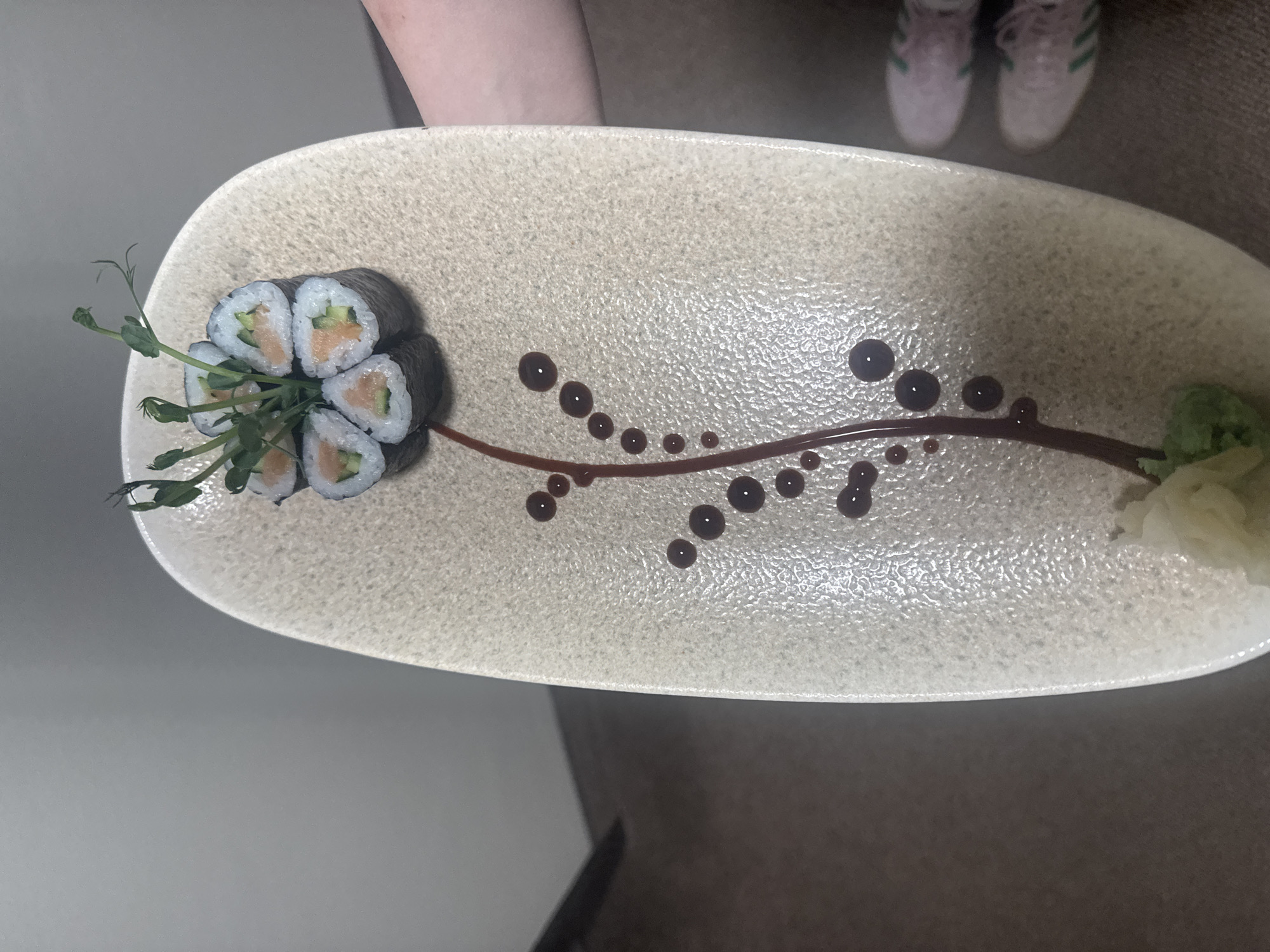 A close-up shot depicts a plate of sushi. The plate is off-white with a textured surface. Six sushi rolls are arranged in a circular pattern at the left side of the plate, garnished with green sprouts. A line of brown sauce, forming a branch-like design, extends from the sushi towards the right side of the plate where a dollop of wasabi sits. The background is blurred, but hints of a person's arm and Adidas sneakers are visible, suggesting the photo was taken indoors.