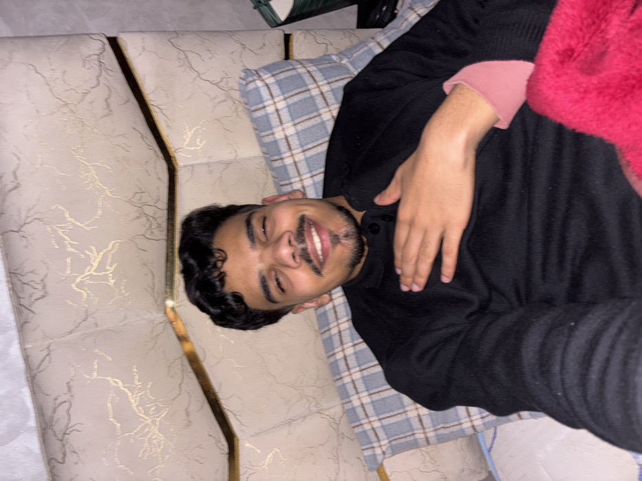 A man with dark curly hair and a mustache lies on a patterned bed, smiling. He wears a black top with a pink sleeve showing underneath. His hand rests on his chest. The bed features a light patterned headboard with gold trim. A light blue plaid pillow supports his head. The scene has a relaxed and casual feel.