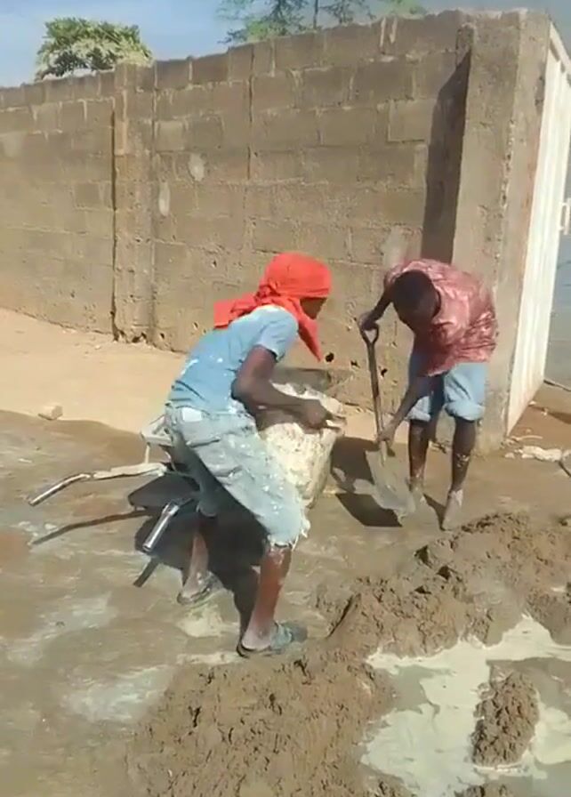 two dark-skinned men working with mud or wet soil outdoors. One man wears a blue shirt, denim shorts, and sandals, and has a red cloth wrapped around his head. He is lifting a bucket high over his head. The other man wears a red and brown patterned shirt, denim shorts, and stands near the wet soil, working with a shovel. A wheelbarrow sits on the ground next to the man with the bucket. Behind them, there's a tan brick wall and a white outbuilding with a door. The ground around them is covered in mud and water. The sky is blue and sunny, with some trees visible in the background.