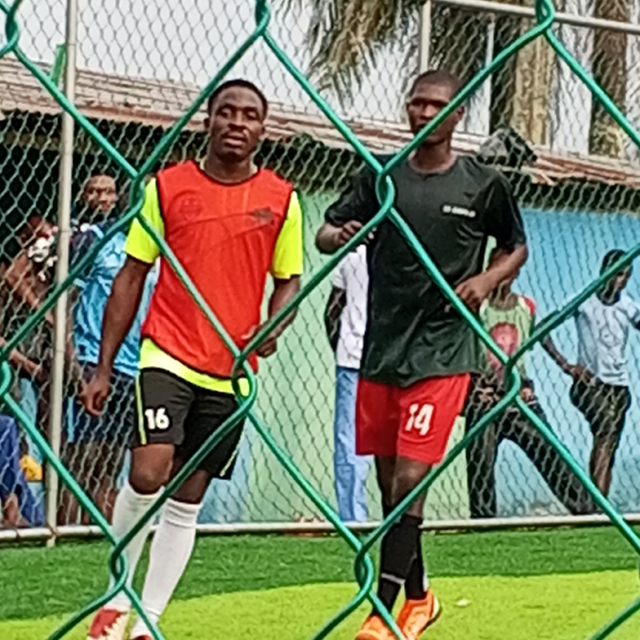 The image presents a forensic view of an outdoor soccer field in Ohoro, Nigeria, observed through a blurred green chain-link fence in the foreground. Two male individuals, presumed athletes, are in the midground on a green artificial turf. The individual on the left wears a yellow t-shirt under a red training bib, black shorts with "16" in white, white long socks, and red/orange soccer cleats; he has a dark complexion and faces slightly towards the viewer. The individual on the right, also with a dark complexion, wears a dark green t-shirt, red shorts with "14" in white, black socks, and orange soccer cleats; he is in motion, facing towards the right side of the frame. Multiple other male individuals are visible in the background, standing near structures including a light green wall and a light blue wall, topped by basic roofing elements. Palm trees are visible in the upper background.