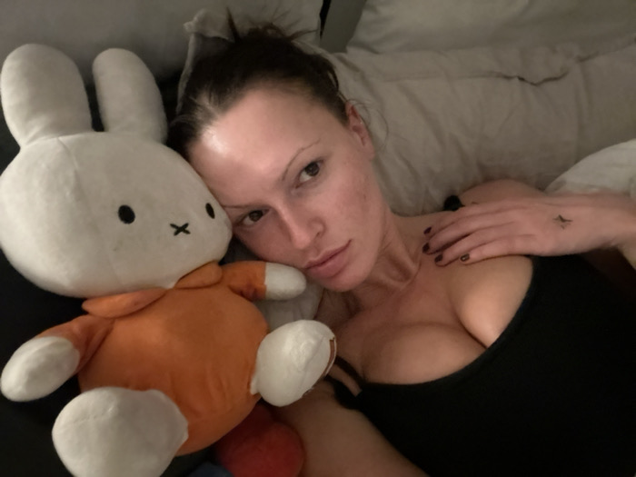 An adult female is depicted lying in what appears to be a bed, her head resting on a light-colored pillow. Her dark hair is pulled back, and she is looking directly at the camera. She has visible skin imperfections on her forehead and cheek. The subject is wearing a black tank top, revealing her cleavage. Her left hand, adorned with dark nail polish and a small, stylized bird or arrow tattoo on its dorsal surface, is placed on her right shoulder. Adjacent to her left side, a white stuffed rabbit with an orange body, consistent with the Miffy character, lies on the bedding. The immediate environment consists of soft, light-colored fabric, indicative of bedding. The specific location within the city of Wealden, United Kingdom, cannot be determined from the visual information presented.