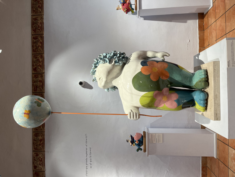 A whimsical ceramic sculpture of a figure with floral designs on its body holds a balloon on a stick. The figure has a head of blue curls and a contemplative expression. A small fish-like sculpture sits on a pedestal below. The setting appears to be an art gallery, with text on the wall beside the balloon and tiles running along the wall's edge. A security camera is visible on the wall above the sculpture.