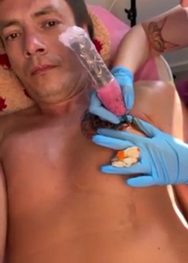A man is getting a tattoo on his chest