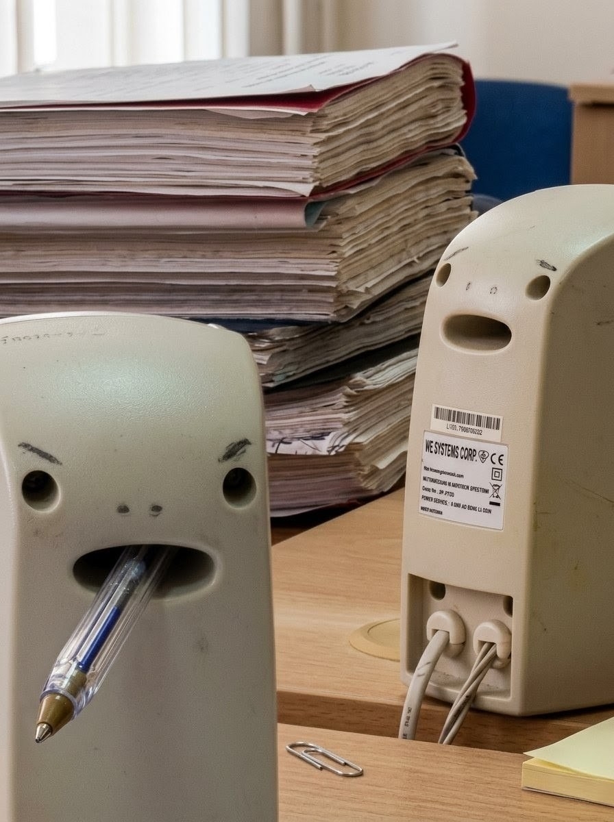 - "desk scene. A large stack of papers is piled in the background, partially obscuring a blue chair. In the foreground, two beige speakers are positioned on the desk. The speaker on the left has a drawn-on face with eyebrows, and a pen is sticking out of its front opening. A paperclip rests on the desk in front of the speaker. The speaker on the right has a label with the words "WE SYSTEMS CORP." and "Made in Bulgaria, Sofia". A yellow sticky note is visible on the right side of the frame." by FM-C7UI02, licensed under CC BY 4.0