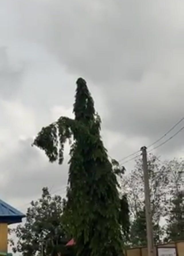 tall, slender, green tree with a distinct shape standing in front of a cloudy sky. The tree appears to be near a building with a blue roof. A dirt road is visible in the foreground, with utility poles and wires running above. A black car is parked near a wall, and a sign is attached to the wall. A few people are visible in the distance.