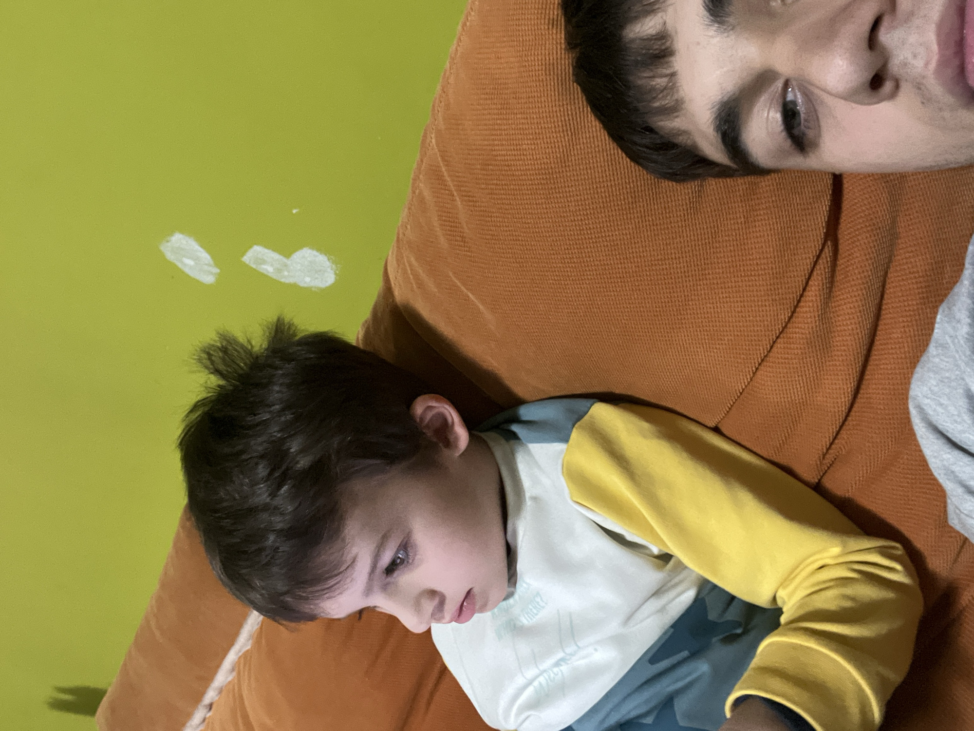 A young boy is lying on an orange corduroy couch, wearing a long-sleeved shirt with yellow sleeves and a white and blue body. His head is turned downwards, and he appears to be looking at something. An adult's face is visible in the upper right corner of the frame, also lying on the couch. The wall behind them is light green with some white patches. The location is in Marten, Bulgaria.