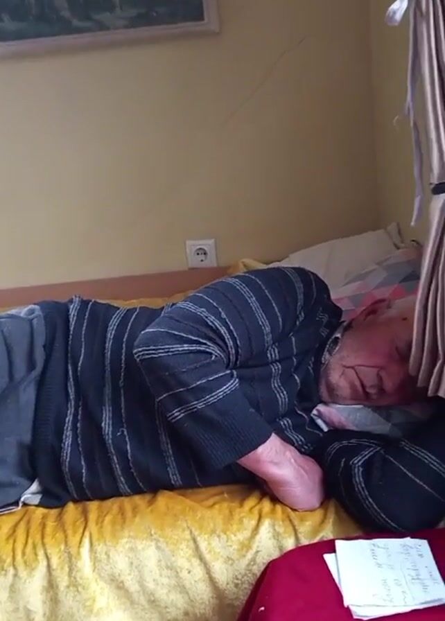 An elderly man is lying on his side on a bed. He is wearing a navy blue and gray striped sweater and gray pants. The bed has a yellow, textured blanket and a pillow with a patterned cover. The man's eyes are closed, and his right arm is bent and tucked under the pillow. To the right of the bed is a small table with a red tablecloth, and several pieces of paper are stacked on it. A cream-colored curtain is partially visible on the right side of the frame. The walls are yellow, and a framed picture hangs on the wall above the bed. An electrical outlet is visible on the wall above the bed. The man makes slight sounds suggesting he may be snoring.