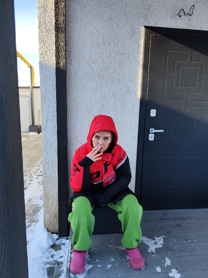 A female subject is seated outdoors in the city of Unknown, Unknown. She is positioned against a light-colored, textured wall, with a dark grey door to her right featuring a geometric pattern, silver handle, and lock. To her left, a dark vertical beam partially obscures a paved area covered with patches of snow, where a yellow pipe and a white building are visible in the background. The ground immediately surrounding the subject is a dark-colored surface, possibly decking, with scattered snow and ice. The subject is wearing a red and black hooded jacket, bright green baggy pants, and bright pink boots. Her hood is up. She has dark hair, light-colored eyes, and red lipstick. She is holding a lit cigarette in her right hand, which is raised towards her mouth, with a small cloud of smoke visible. Her gaze is directed towards the camera. The scene is illuminated by natural daylight under clear skies, indicative of winter conditions.