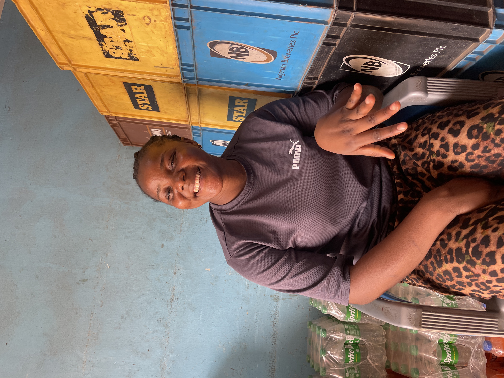 A woman is sitting in a chair, with stacks of bottled water at her feet and crates stacked behind her. The crates are labeled "STAR" and "Nigerian Breweries Plc". The woman is wearing a gray Puma shirt and a leopard print skirt. She is smiling and holding up one hand with her fingers spread. The location is a store or warehouse in Jos, Nigeria, given the brewery markings on the crates.