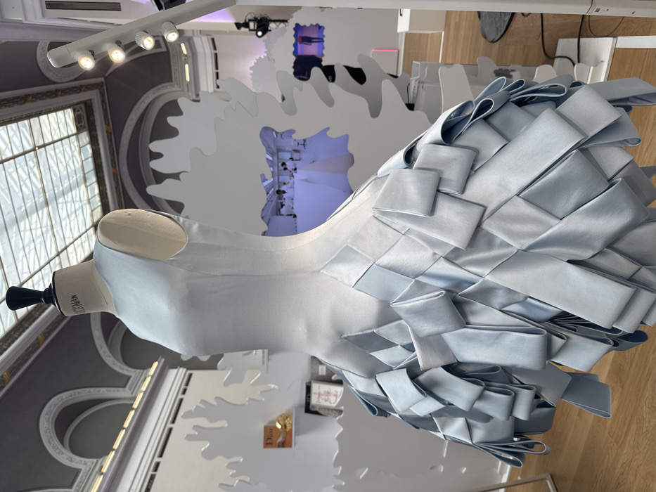 An interior photograph captures a light blue, sleeveless satin dress displayed on a beige "STOCKMAN" tailor's mannequin. The dress features a smooth bodice and a voluminous skirt composed of intricately folded and woven satin ribbons, creating a textured, geometric pattern. The mannequin has a black finial and is positioned on a light wooden floor. The setting is a high-ceilinged room with ornate grey vaulted architecture and intricate white classical moldings, illuminated by a large glass skylight with a visible metal grid. White, irregularly shaped partitions serve as exhibition elements. To the left, behind these partitions, shelves hold a "Dior" branded orange box, a golden spherical object, and other display items. To the right, through a cutout in the partitions, a brightly lit room is visible where multiple individuals in white lab coats or tunics are seated at long white tables, suggesting a workshop or studio environment. Further right, a screen displays a figure in a fashion pose. A vertical white pole with multiple spotlights stands in the mid-ground. This scene is located within a grand, historic exhibition hall, museum, or event space in Paris, France, hosting a high-fashion display.