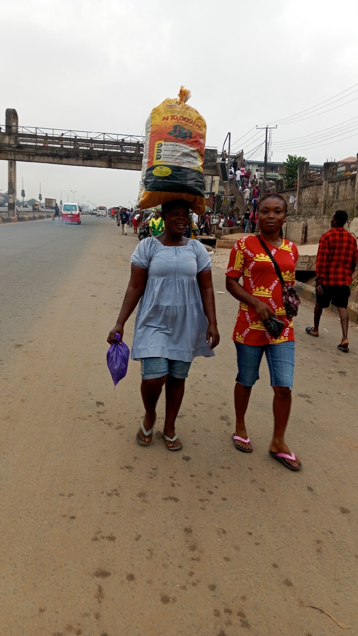The image depicts a daytime street scene in Onitsha, Nigeria, under an overcast sky. In the foreground, two women walk side-by-side on an asphalt road. The woman on the left wears a light blue short-sleeved, tiered dress over denim shorts and silver flip-flops. She balances a large, yellow-orange sack, marked with "N 10,000" and product details including "CHARCOAL," on her head. Her left hand holds a small purple plastic bag. The woman on the right wears a red short-sleeved shirt patterned with yellow crowns and "KING" text, over denim shorts and pink flip-flops. She carries a black crossbody bag with a patterned strap. In the mid-ground, a multi-lane road stretches into the distance on the left, showing light vehicle traffic including a white minivan or bus. A concrete pedestrian overpass spans the road, populated by several individuals. On the right, a concrete structure with a public staircase ascends, also showing pedestrians. Alongside the road on the right, various people are visible on the ground level amidst what appears to be street activity or market stalls. A man in a red and black plaid shirt and dark shorts walks away from the camera on the far right. Utility poles and power lines are visible against the light grey sky.