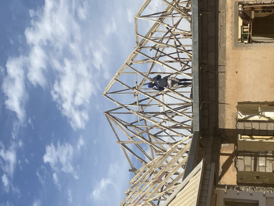 An outdoor scene of building construction is captured in Jos, Nigeria, under a bright, partly cloudy blue sky