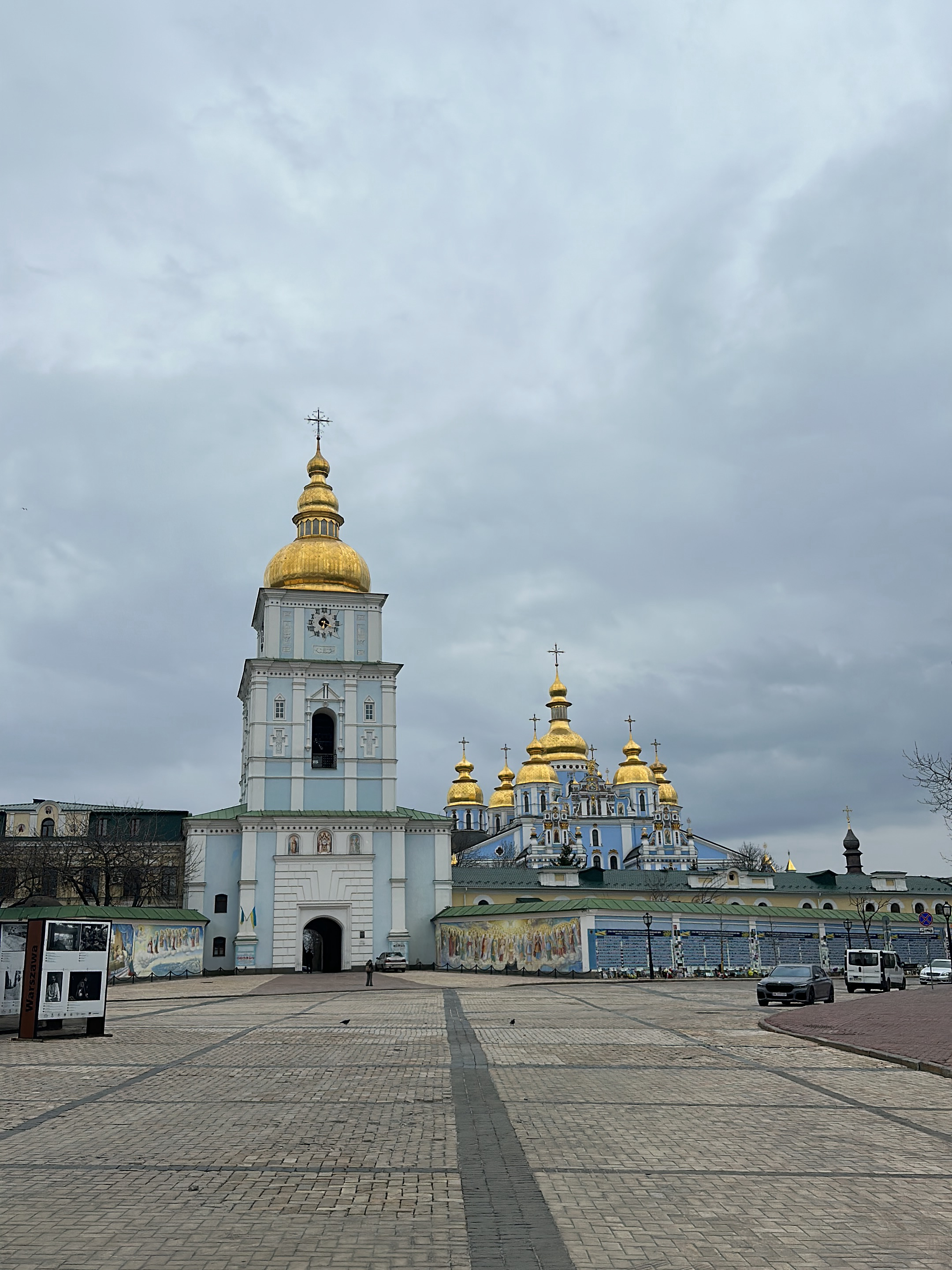 The image depicts St. Michael's Golden-Domed Monastery in Kyiv, Ukraine, on an overcast day. The architectural complex, with its distinct blue facade and gilded domes, dominates the scene. A bell tower stands to the left, also featuring a gold dome. The foreground is a large, paved square, partially occupied by parked vehicles and a display stand. A few individuals and pigeons are visible within the square. The sky is filled with dense, grey clouds.