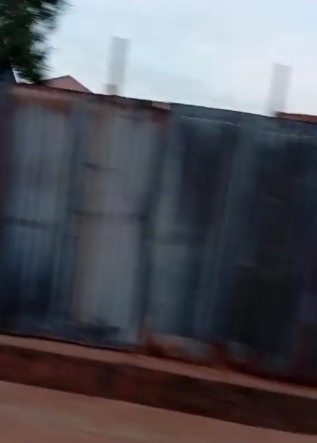 The video, taken from a moving vehicle, shows the roadside. Initially, a corrugated metal fence is visible. Then the video passes a building, painted bright blue with a brown roof, standing behind a black metal fence with white concrete posts. The road is a reddish brown color. The sky is overcast.