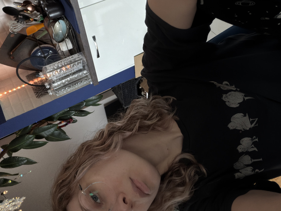 A female individual is positioned in the foreground, facing the camera with a neutral expression. She has light, wavy hair and wears clear-rimmed glasses, a black t-shirt with a light-colored graphic print depicting multiple winged figures and partial text, and dark pants with a celestial pattern. The scene is set indoors in Boreti, Montenegro. The background reveals a domestic environment, including a partial kitchen area. To the left, a large potted plant with dark green leaves is visible, adorned with small, clear decorative lights and a string of colorful beads. A dark blue structural element separates this area from a kitchen counter. On the light-colored kitchen countertop, three rectangular "VODAVODA" mineral water bottles are arranged in a carrier, adjacent to a dish rack holding various kitchen utensils, a whisk, a yellow spatula, a light blue bowl, and a dark mug. A cutting board and other kitchen items are visible behind these objects. Orange fairy lights are strung along the upper part of the background. A dark wicker basket and a cardboard box are partially visible in the lower background. No specific interactions beyond posing for the photograph are evident.