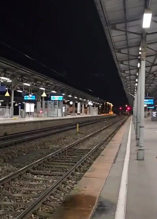 A short, low-quality video shows an empty train station platform at night
