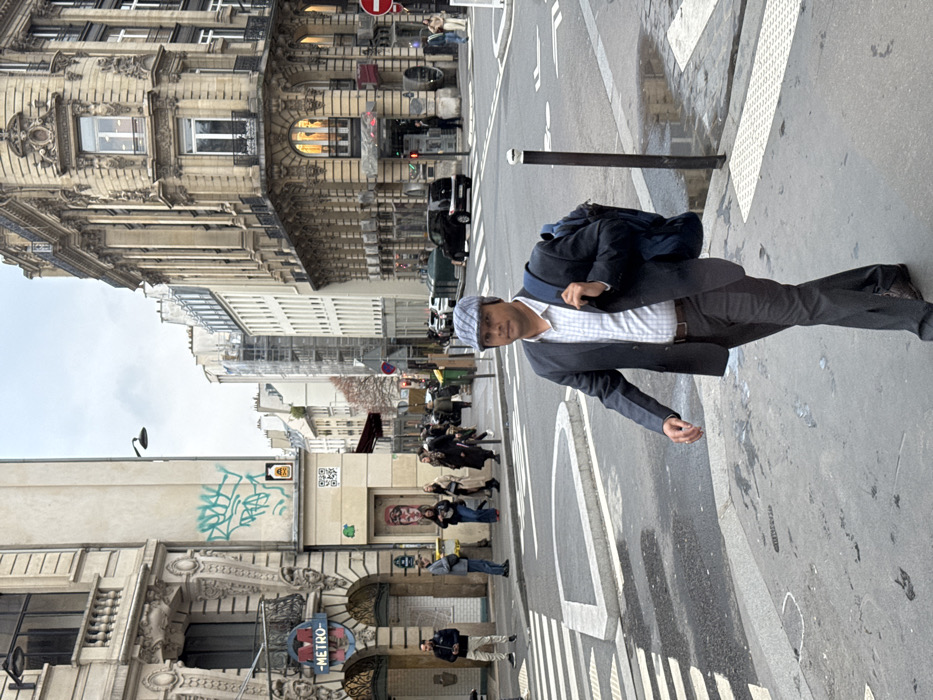 The image depicts an adult male walking on a city sidewalk near the Saint-Paul Metro station at the intersection of Rue Saint-Antoine and Rue Pavée in the 4th arrondissement of Paris, France
