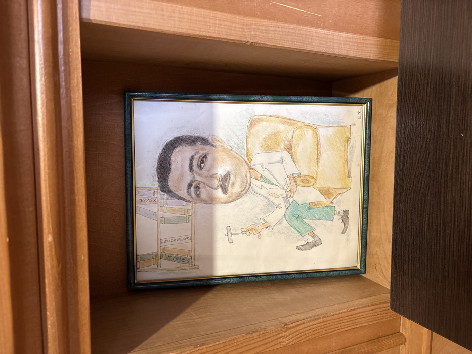 A framed, surreal drawing sits within a wooden cabinet. It features a man with an oversized head, a prominent mustache, and a suit. He is depicted with a hammer in hand. An oversized armchair forms the bulk of his body. To his left, a bookshelf filled with books labeled in Cyrillic letters is visible. The frame is a dark green with a thin gold inner border.