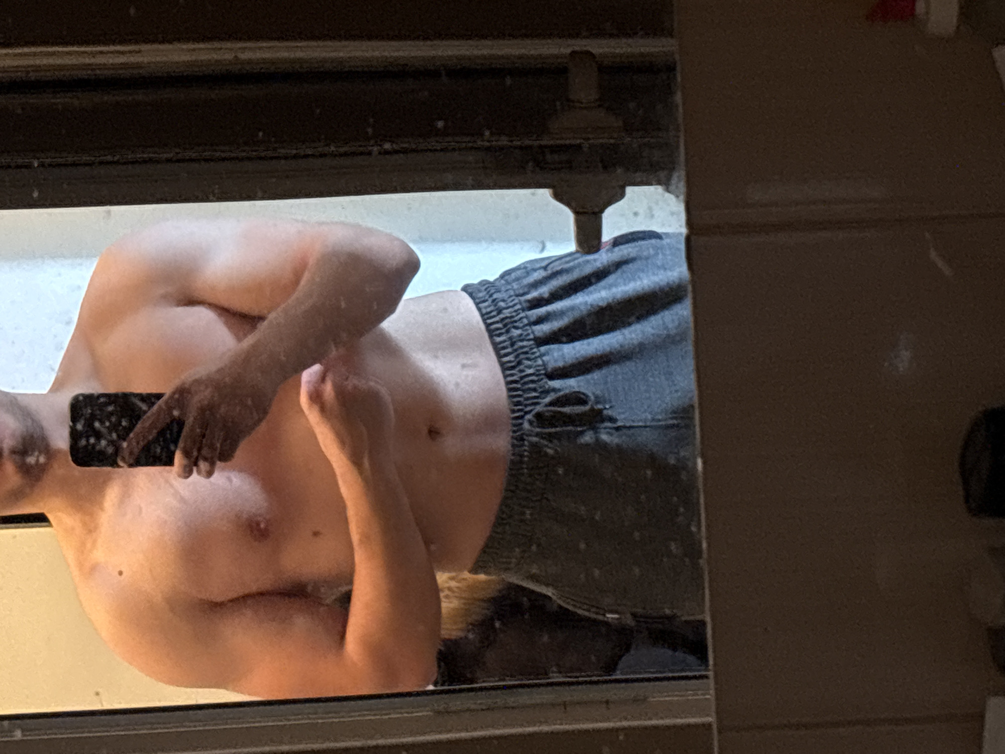 A torso of a shirtless man with gray sweatpants is visible in a mirror reflection. He is holding a black smartphone in his left hand, obscuring his face. The reflection is within a window frame, with a dark surface above and to the right. The environment outside the window is blurred. I am unable to determine the location based solely on the image.