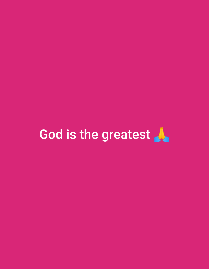The image displays white text centered on a solid magenta background. The text reads "God is the greatest," immediately followed by a praying hands emoji (🙏) rendered in yellow and blue. No discernible people, objects beyond the text and emoji, or specific environmental details are present. The location is undeterminable.