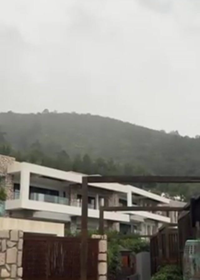 modern, multi-story building with stone and white facade elements. The building has a flat roof with an open structure above. In the background, a heavily forested hillside is visible, shrouded in mist or rain. The sky is overcast and uniformly grey, suggesting poor weather conditions. The foreground features a wooden gate and a few other wooden structures.
