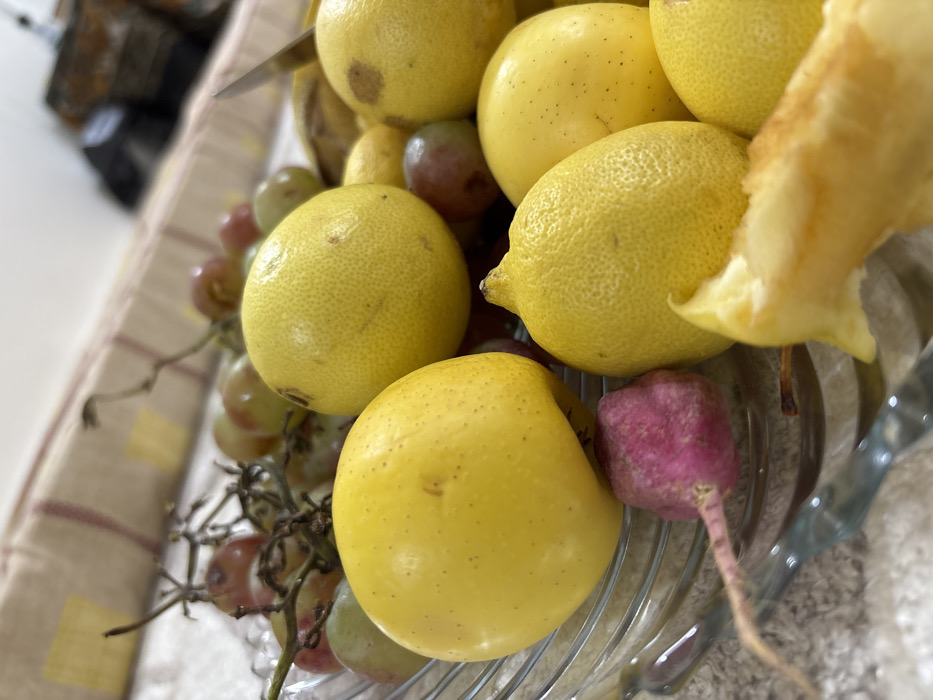 The image displays a close-up, low-angle view of a clear glass fruit bowl containing an assortment of fresh produce, located in Mu'adammiyat ash-Sham, Syria. Prominently featured are multiple whole yellow lemons with textured skins, some showing minor surface imperfections. Beneath and behind the lemons, clusters of red and green grapes are visible, along with individual grapes. A single small, purple-red radish with a slender root extends from its base in the lower-left section of the bowl. In the bottom-right foreground, a piece of light-yellow fruit, possibly an apple or pear, is partially consumed, revealing some browning on its exposed flesh. The background is blurred, showing a light-colored fabric surface with faint striped and rectangular patterns. A metallic knife blade is partially visible in the upper right background, near indistinct yellow-brown objects resembling bananas. A dark, unidentified object is present in the far, blurred background. The scene is brightly illuminated.