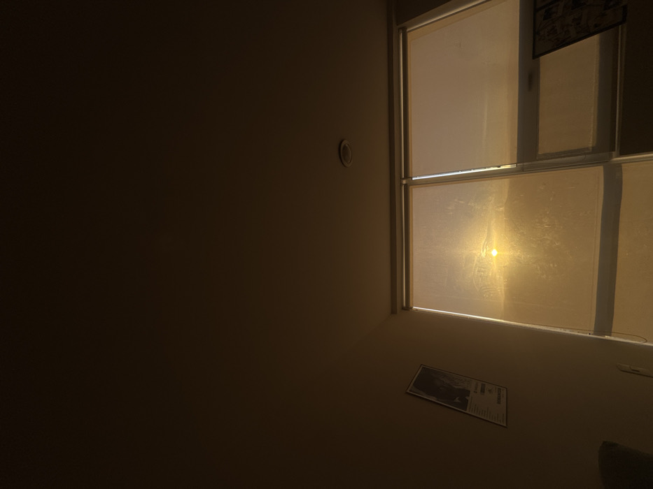 The image presents an interior room in Puebla City, Mexico, illuminated by a low-angle sun, indicating either sunrise or sunset. The prominent feature is a large, multi-pane window occupying the right and lower-middle portions of the frame. Through the left-center pane, the sun is visible as a distinct, bright golden disc, casting intense light that permeates the scene. The view beyond the window reveals a hazy landscape consistent with distant terrain and urban structures from an elevated floor. Light-colored roller blinds or sheer curtains are partially drawn over the window, diffusing the sunlight. Smudges and streaks are present on the window glass. To the left, a light brown/beige wall displays a vertically oriented poster or artwork, appearing to depict a monochrome image with text. On the ceiling, a single circular recessed light fixture is visible. The upper portion of the room, including the ceiling and upper wall, is dark brown due to underexposure or shadow. No individuals are visible within the frame. Indistinct objects are partially visible in the lower-left and lower-right corners of the room.