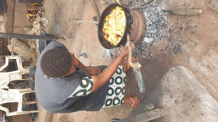 In Obosi, Nigeria, an outdoor scene captures an adult female actively cooking