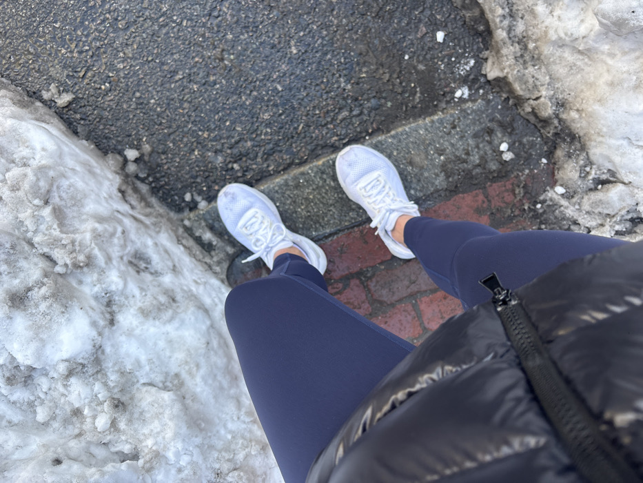 The image presents an overhead perspective of an individual standing on a red brick sidewalk in an urban environment characteristic of Boston, Massachusetts, United States of America. The subject is wearing dark blue athletic leggings and white athletic shoes, which exhibit minor smudging. A portion of a dark, possibly puffer-style, jacket with a visible black zipper is present in the upper left quadrant. To the left of the brick sidewalk, a substantial, dirty, and partially melted snowbank is visible. A grey concrete curb delineates the sidewalk from a dark, wet asphalt street on the right. The scene indicates winter or post-winter conditions.