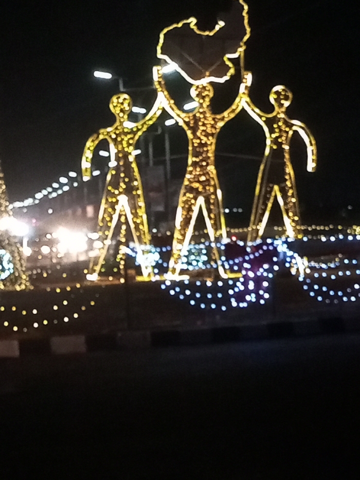 Three illuminated figures stand in the center, shaped like humans, with yellow lights outlining their forms. The middle figure raises a shape above their head, possibly a map outline. Strings of white and blue lights decorate the base and surrounding area. Additional lights blur in the background, indicating a cityscape at night. A dark road stretches beneath the illuminated display.