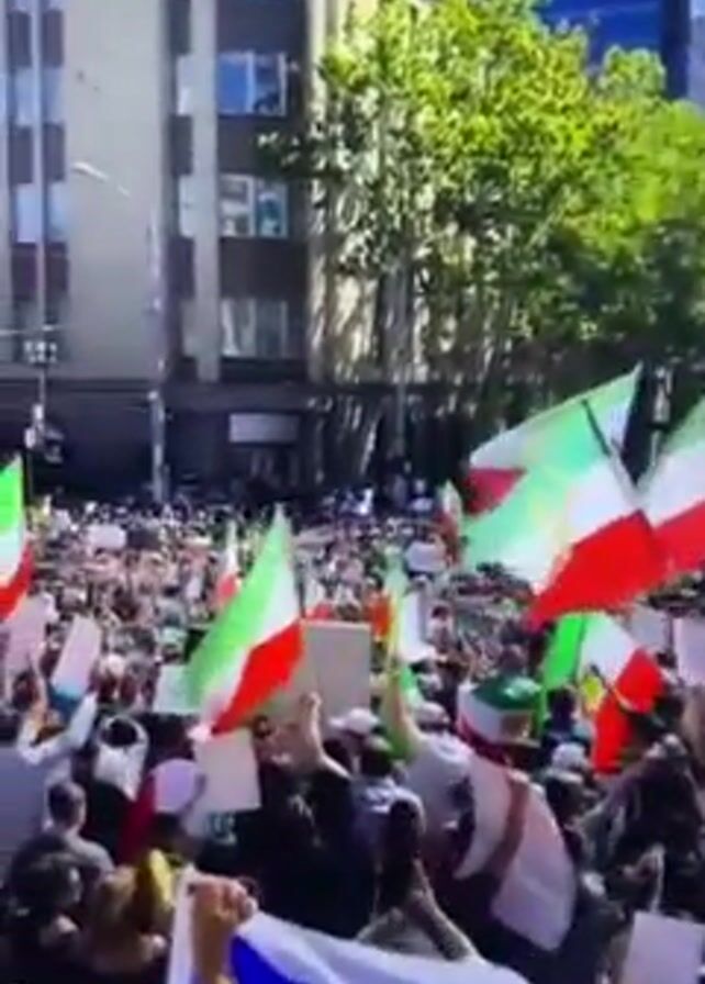 The video depicts a large crowd of people gathered in a city street, waving Iranian flags
