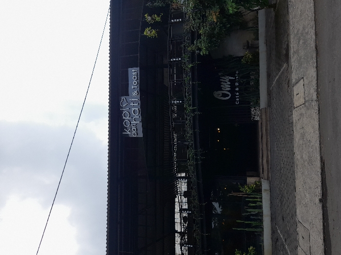 storefront of a cafe called "Omy's Cafe & Resto" located in Kecamatan Buduran, Indonesia. The storefront is black and features a sign with the cafe's name. Above the cafe's sign is a black sign with the words "kopi dari hati & toast". There are several potted plants in front of the storefront. The cafe is located on a street with a cobblestone driveway leading to the front entrance. The sky is overcast. There are no people in the image.