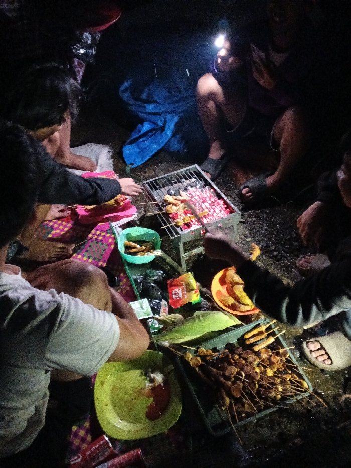 The image depicts a nighttime outdoor gathering in Ciherang, Indonesia, illuminated primarily by a headlamp, a smartphone screen, and glowing embers from a barbecue grill
