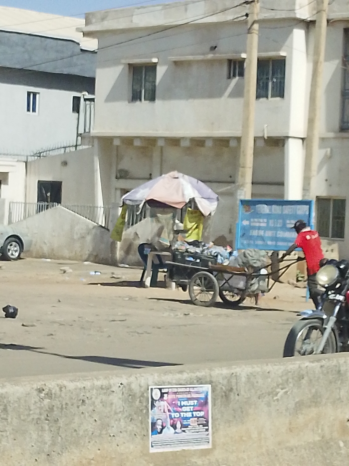 A daytime street scene in Sabon Gari East, Nigeria, depicts an unpaved, dusty ground with scattered debris. In the midground, a man in a red short-sleeved shirt and a dark cap pushes or maneuvers a two-wheeled wooden handcart loaded with miscellaneous items, including bundles and bags, under a large, multi-colored (white, light blue, light pink) umbrella with a green tarp draped from one side. To the man's left, a blue rectangular sign with white text and an arrow pointing left is partially visible. Behind these elements, a light-colored, multi-story building with multiple rectangular windows, some with security bars, stands under a clear sky. Further left, a darker two-story building is partially visible behind a white security fence. Overhead utility lines and several utility poles are present. On the far left, the rear of a light-colored car is parked. In the foreground, the front section of a dark-colored motorcycle is visible on the right. A concrete barrier runs across the immediate foreground, to which a poster featuring images of people and the prominent text "I MUST GET TO THE TOP" is affixed. Shadows indicate direct sunlight.