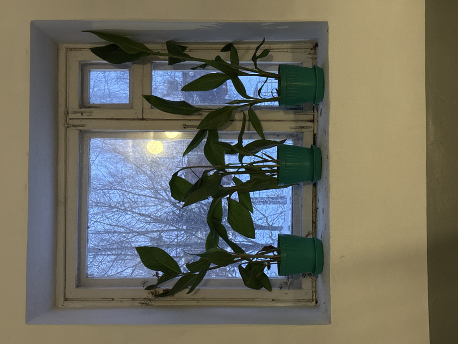 The image displays an interior view of a window in Прикамский, Russia, looking out onto a winter landscape. Three broad-leafed plants, appearing healthy with dark green foliage, are positioned on the wide, white-painted windowsill. Each plant is contained within a ribbed, teal-colored plastic pot with a matching circular saucer. The leftmost plant exhibits some leaves that are slightly drooping and show minor browning at their edges. The window itself features a white-painted wooden frame, composed of multiple panes, including a smaller rectangular pane in the upper right quadrant. The frame appears weathered, with visible wear and dirt accumulation, and a metal latch is present on the central vertical mullion. Beyond the window, the outdoor environment is snow-covered, with the ground and visible surfaces blanketed in white. Numerous deciduous trees with bare branches are prominent, suggesting a winter season. The sky appears overcast and bright, casting a cool, bluish light over the exterior. Two circular, illuminated light sources, consistent with streetlights, are visible through the bare tree branches in the middle distance. The interior wall surrounding the window is painted a light cream or off-white color. Below the windowsill, the wall transitions to a darker, solid grey-green hue, marked by a distinct horizontal line. No individuals or direct human actions are visible within the frame.